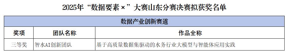 近日,由国家数据局、山东省人民政府联合指导,山东省大数据局等21家单位联合主办的2025年“数据要素×”大赛山东分赛决赛获奖名单正式公布。凭借其在水务数据与AI创新应用领域的突出表现,浪潮海晏联合智慧(东营)大数据有限公司提报的“基于高质量数据集驱动的水务行业大模型与智能体应用实践”案例,荣获“数据产业创新赛道”三等奖。